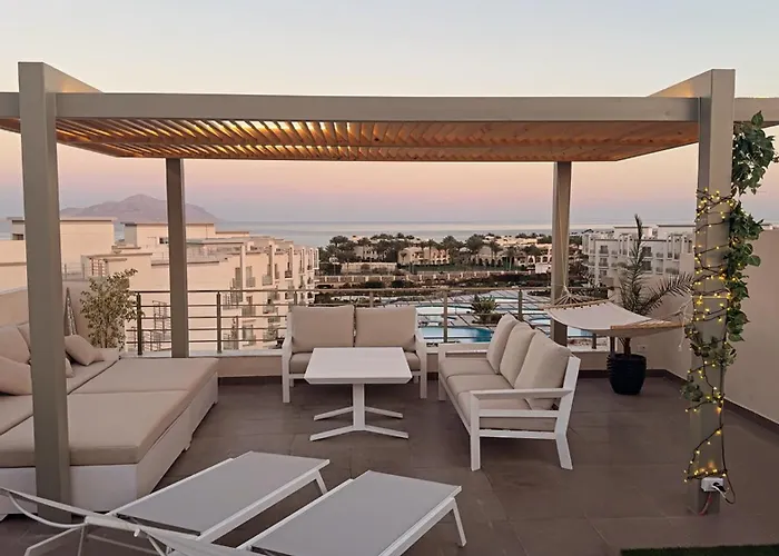 The spacious 2-bedroom Sunny Beach Penthouse Free Beach, Pools, And Privat Roof Sharm el-Sheikh apartment is located in Sharm el-Sheikh, about 10 minutes' drive from the Soho square dancing fountain, and pampers guests with a hot tub. 3.2 km from the apartment you will find the Musical Fountain Sharm el-Sheikh.